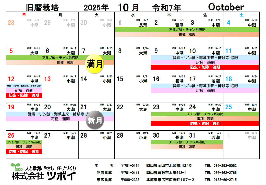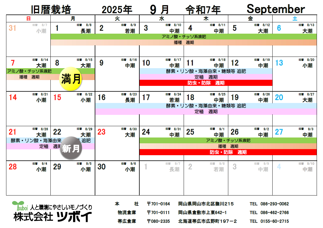 2025/09/02 旧暦栽培カレンダー 2025年 更新しました。