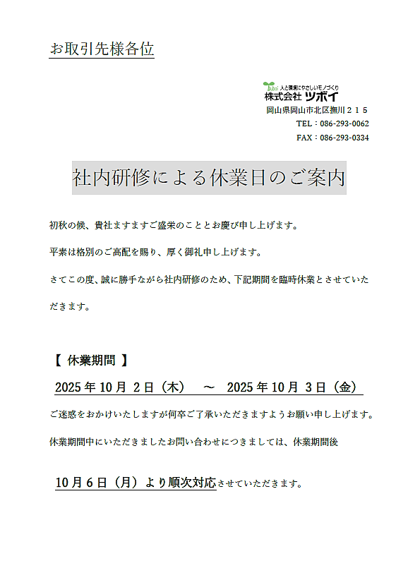 2025/09/26 社内研修による休業日のご案内