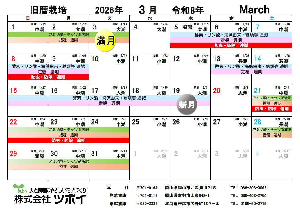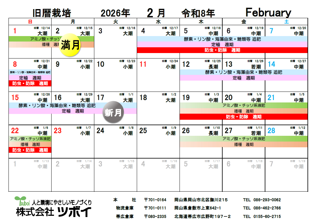 2026/02/12 旧暦栽培カレンダー 2026年 2月・3月 更新しております。
