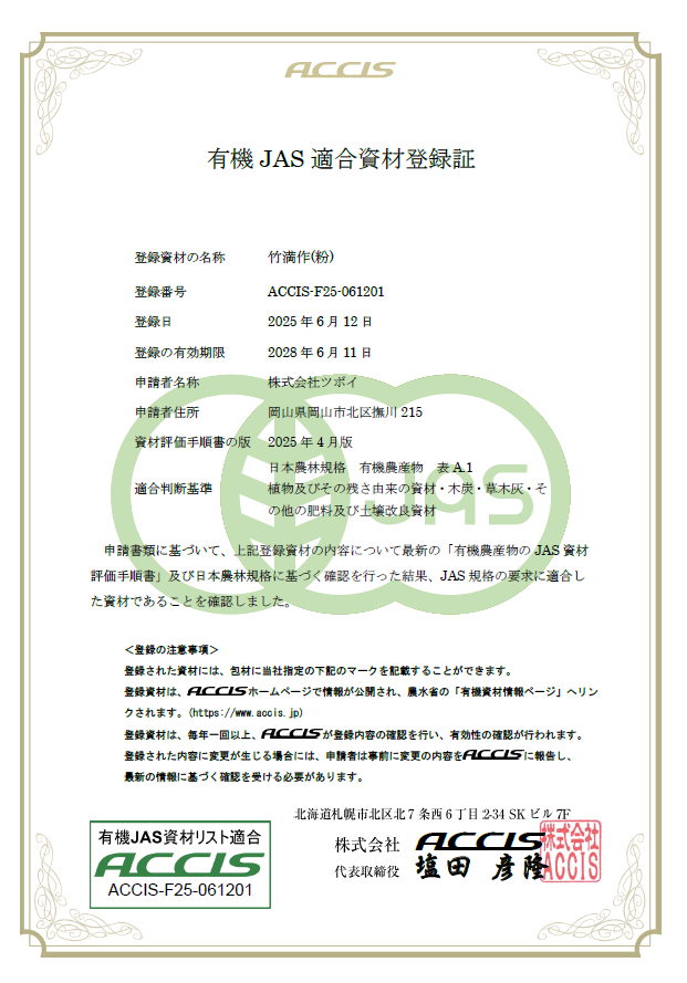竹満作はこの度、有機JAS適合資材にも登録されており、安心して