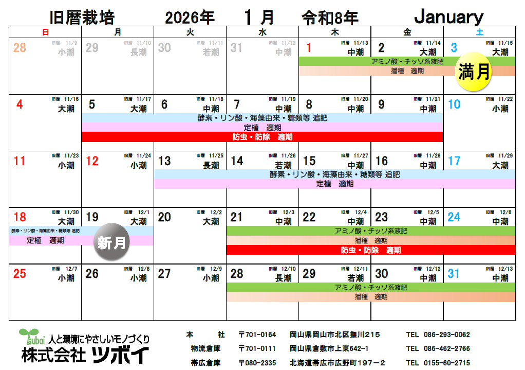 旧暦栽培カレンダー 2026年 1月 ・ 2月